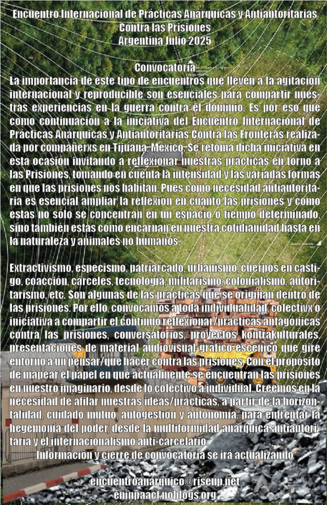 International Meeting of Anarchist and Anti-authoritarian Practices Against Prisons: https://eninpaacf.noblogs.org/convocatoria/